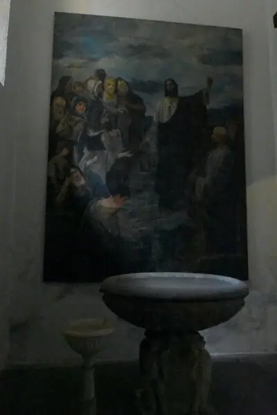 Encontramos la gran pila de piedra gris que contenía el agua bautismal y otra pequeña en mármol claro en la que se daba propiamente el primero de los Sacramentos.